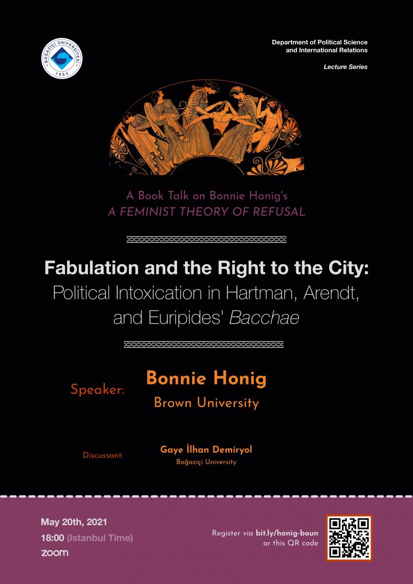A Feminist Theory of Refusal argues that refusal is not the entirety of any politics, but it is a necessary part of any decent democratic politics and it is often needed by dissidents or minorities who, for no good reason, lack voice or power in current institutional arrangements. ‘A Feminist Theory of Refusal’ offers a critical examination of three refusal concepts in political theory — inoperativity (Agamben), inclination (Cavarero) and fabulation (Hartman) — reading Euripides’ Bacchae through the lens of each of these concepts and then, recursively, offers “bacchae” readings of each of the concepts, finding their limits, expanding their promise for refusal. Honig depathologizes the women of the Bacchae and reconsiders them in connection with contemporary Bacchaes from recent film, drama and literature. In her lecture for Bogazici, Professor Honig will present the work on Saidiya Hartman and Hannah Arendt, entitled Fabulation and the Right to the City: Political Intoxication in Hartman, Arendt, and Euripides’ Bacchae.